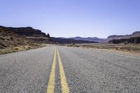 An endless road cuts through the sprawling desert landscape of Hite Red Rocks in Canyonlands, Utah. The clear sky and straight road leading to the horizon create a sense of endlessness and freedom.