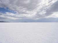 This is an image of the Bonneville Speedway in Salt Lake City, Utah, USA. The open space and endless road make for a calm and serene landscape. The blue sky and clouds create a beautiful backdrop against the desert and mountain scenery. In the distance, you can see the vast salt lake, with its salt surface reflecting the sunlight. This photo captures the tranquil beauty of nature and the abundance of water resources in the area.