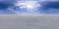 Vast salt flat under a sunny sky, with clouds partially dotting the horizon. An open space desert landscape, where the sun is distinctly visible, creating endless reflections across the salt-covered terrain.