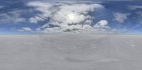 Expansive salt flat under a bright sunlit sky. Clouds hang over the open space, capturing the vast desert landscape typically found in regions like Utah or Bolivia's salt lakes.