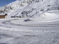 A picturesque winter landscape in the Alps of France. A curving road cuts through the snow-covered mountain range, offering a stunning view. The clear sky adds to the beauty of this popular tourist attraction.
