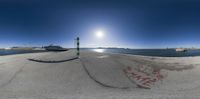 A serene view of Lisbon's coastal landscape, with the azure ocean stretching out to the horizon. The clear sky and bright sunshine highlight the sandy beach and vibrant graffiti. A perfect day to explore the city's open spaces.