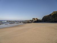 This is an image of a sandy beach in Portugal, Europe. The azure blue sky contrasts with the clear open space and coastline. In the foreground, there are footprints in the sand, leading towards a collection of rocks. The ocean waves gently touch the shore. The landscape showcases the natural beauty of the European coastline. A lone bird can be seen in the distance, adding to the tranquility of the scene. This photo captures a peaceful day in nature, with the water and sky reflecting the serenity of the surroundings.