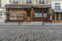This image captures the charm of a classic architecture in an urban setting. The building, with its beautiful facade, stands tall amidst the cobblestone road and the bustling city life of Paris, France. The warm dawn light illuminates the scene, creating a picturesque atmosphere. The city road is lined with various shops and cafes, inviting residents and visitors to eat out and enjoy the vibrant city atmosphere. This image showcases the blend of historic elegance and modern urban design of Paris, making it an ideal representation of city living in Europe.