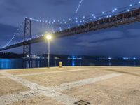 This is a stunning night scene featuring a large suspension bridge in Lisbon, Portugal. The image captures the landscape with the bridge stretching across the ocean coastline, illuminated by artificial lights. In the foreground, there are street lights and a pier leading to an open space. The dark sky is dotted with clouds, creating a dramatic backdrop. The image showcases the infrastructure and beauty of Lisbon's harbor at night. It represents the combination of natural elements such as water and sky, along with man-made structures like the bridge and street lights.