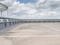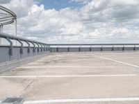 This image captures the profile of a modern architecture parking garage in Berlin, Germany. The concrete street leads to an open space with clear skies and clouds in the background. The architectural design reflects the modernity of Berlin, a city known for its innovative structures. The parking deck provides ample space for vehicles in this bustling European city. This photo showcases the combination of modern architecture and urban infrastructure that can be found in Berlin, Germany.