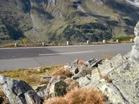 This is an image of a lone man riding his motorcycle in the mountains of Austria. The clear sky and majestic landscape of Europe create a breathtaking view. The road is empty, with no traffic in sight, allowing the rider to enjoy the tranquility of nature. The asphalt road stretches ahead, winding through the mountains. This photo captures the freedom and adventure of a day spent exploring the beautiful Austrian countryside on a motorcycle.
