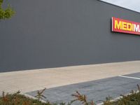 This is a photo of the entrance of an industrial warehouse building in Germany, Europe. The modern architecture and urban design of the facade is visible, with the sign 'Mechania' displayed above the entrance. The surrounding landscape shows a green grassy slope and asphalt road. The city life ambiance can be seen with other buildings in the background. This image represents the combination of industrial and urban elements in Germany.
