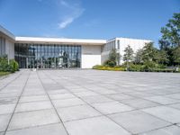 The modern architecture of Berlin's business district shines against a clear sky. The large white building with many windows is surrounded by trees, bushes, and stone flooring, creating an open space. A perfect representation of Europe's financial hub.