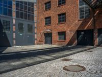 Classic architecture in urban Berlin. Cobblestone streets lead to old warehouses and factories. Hard shadows interplay with vegetation in open spaces. A blend of European charm and urban design in the city.