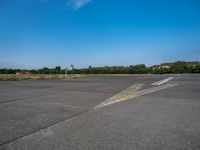 This is an image of an open space in Berlin, Germany. The clear sky and city skyline form the backdrop for an asphalt road leading to a basketball court. The composite material surface of the court is surrounded by trees and urban design elements. In the distance, a stadium can be seen, showcasing the city's sport infrastructure. The image captures the vibrant city life and urban landscape of Berlin on a sunny day. It represents the perfect blend of nature and urban design in Europe's capital city, Germany.