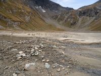 This is an image of a rugged landscape in Austria, Europe. The rocky area features majestic mountains in the background and a stream flowing through it. The cloudy sky adds to the dramatic atmosphere of the scene. The dirt and gravel surface of the road gives the impression of an off-road track, perfect for nature enthusiasts and adventurers. This photo captures the open space and natural beauty of Austria's mountainous terrain. It is a great representation of the scenic landscapes that can be found in Europe.