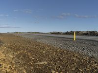 a paved road with gravel and rocks surrounding it in a barren, arid landscape on the horizon