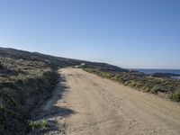 This image shows a sandy and dry road positioned alongside a beautiful beach in Portugal, Europe. The road surface is empty and lined with vegetation, including plants and shrubs. The landscape features a clear horizon, with the grassy surface sloping down towards the coastline. In the distance, the ocean water can be seen, reflecting the clear sky above. This photo captures the serene nature and natural beauty of the Portuguese coastline on a sunny day.