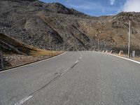 a motorcycle driving on the road between mountains and grass as a sign points to a right turn