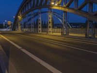 A stunning cityscape of Frankfurt, Germany at dawn. The metropolitan area comes alive under the glowing lights of the city. The skyline is beautifully framed by a magnificent tied-arch bridge.