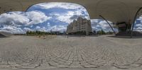 Urban design in Europe, showcasing modern architecture and cobblestone streets. A quarter of the city's open space with straight roads and unique profiles. Clouds hover above the urban landscape.