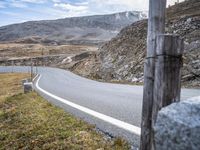 a man is riding a motorcycle in the mountains on a road that is winding through the grass