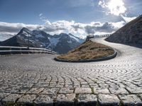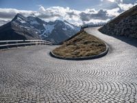 A scenic road in Europe, surrounded by majestic mountains and grassy slopes. The winding pathway showcases a clear sky and abundant sunshine. Cobbles add charm to the switchbacks, while Armco barriers ensure safety. A perfect day in Austria.
