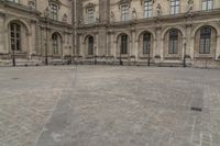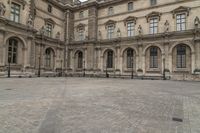 This image captures the grandeur of classic architecture in the heart of Paris, France. The gloomy grey sky serves as a dramatic backdrop to the magnificent palace, showcasing its ornate facade and intricate design. The open space of the plaza and courtyard adds to the urban charm of the city. The arcades and arches create a sense of depth and perspective in the composition. This photo encapsulates the essence of city life in Europe, showcasing the timeless beauty and urban design of Paris.