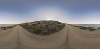 a 360 - angle image of a trail in a desert area near the ocean at sunset