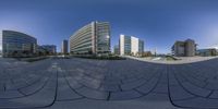 Panoramic view of Lisbon's business district, showcasing modern architecture and urban design. The fish eye lens effect creates a unique perspective, capturing the city's skyscrapers, gardens, and open spaces.