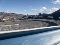 a car at the entrance to a large industrial site in a mountainous area with mountains in the background