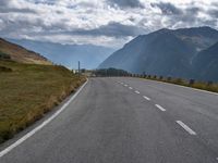 A scenic landscape in Austria, featuring a winding asphalt road surrounded by mountains and rural highlands. The road surface, tar, and straight path create a picturesque thoroughfare. Clouds dot the sky, adding to the natural beauty of the day in Europe.