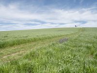This image showcases the picturesque rural landscape of Germany in Europe. The clear sky overhead complements the green and lush fields. In the foreground, a path cuts through the grassy surface, leading the viewer's gaze towards the tree-lined edge. This scenic view represents a typical day in the countryside, highlighting the beauty of nature and the agricultural heritage of the region.