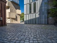 cobblestone driveway surrounded by modern buildings on sunny day with sun reflecting onto the windows