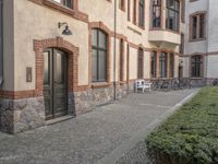 A classic architecture building with a beautiful facade in Berlin, Germany. Cobblestone road surface leads to a charming courtyard with shops and cafes. This urban design captures the essence of city life in Europe.