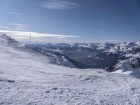 A breathtaking view from the top of a snow-covered mountain in the French Alps. The clear sky highlights the majestic mountain range, while a lone skier takes in the stunning winter landscape.