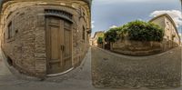 A classic European alleyway in Italy. Cobblestone road lined with charming buildings and colorful facades. A straight path leads to a door in the center of the image. A picturesque suburban village scene.