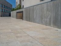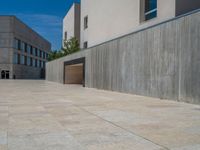 A modern office building in Spain's business district, with a concrete wall and paver surface. The open space plaza is surrounded by modern architecture, under a clear sky in Europe.
