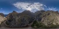 Aerial view of Majorca's coastal landscape in Spain. Clear sky casts hard shadows over rock walls and open spaces. Gravel areas and dirt surfaces blend with nature's beauty in this European paradise.
