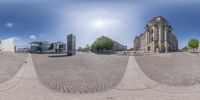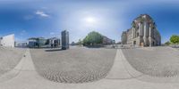A fish-eye lens captures the vibrant cityscape of Berlin, Germany. Modern architecture and corporate headquarters contrast with the historic buildings. People walk across the square in this bustling European business district.