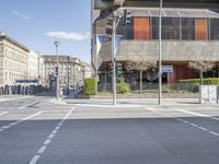 a empty street in the middle of city with no traffic cones and signs in the middle of it
