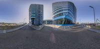 A modern urban landscape in Holland, Netherlands. Three buildings at an intersection with a paved street below, under a clear blue sky and fluffy clouds. The city's business district showcases the vibrant architecture and design of Europe.
