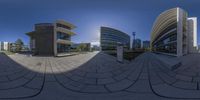 a 360 - view image taken of the outside of a building with two different buildings in front of it