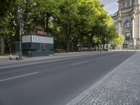 A picturesque street in Berlin, Germany, lined with beautiful trees. The charming architecture of the building on the right adds character to the scene. A perfect day to explore the city's urban nature.