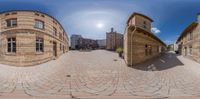 A classic European city scene in Berlin. Brick buildings line the straight road, while smaller circular structures add architectural interest. Open spaces and courtyards contrast with the bustling city life. A clear sky creates hard shadows on the urban design.