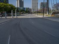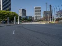 View looking straight down a road in Barcelona, Spain. Modern architecture dominates the cityscape, casting hard shadows on the asphalt. A clear sky adds to the vibrant urban atmosphere of this European city.