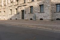 A classic architecture scene in Berlin, Germany. The asphalt road creates hard shadows under the bright sunlight. The urban landscape showcases the city's unique blend of modern and classic architecture.