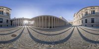 A distorted view of Berlin's cityscape, captured through a camera lens. The modern architecture and classic buildings blend harmoniously in this vibrant European city. The clear sky and hard shadows add depth and drama to the urban landscape.