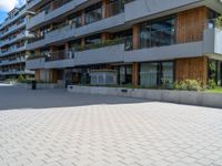 a person is riding down a brick road in front of apartment buildings on a cloudy day