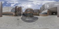 A classic European city scene in Germany. The photo captures a large circular building near the road curb, surrounded by stunning architecture and cobblestone streets. The clear sky adds to the beauty of the urban design.