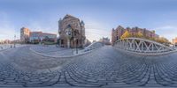 a 360 view of a bridge that crosses over a river surrounded by buildings and trees