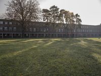 a grassy area with several trees and a building in the distance in sunlight light rays
