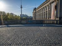 Classic architecture in Berlin, Germany. Sun shines on cobblestone roads casting hard shadows. Urban design blends with city life under clear skies. Museums and bridges showcase the essence of European urban architecture.