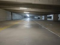 This image captures the urban landscape of Porto, Portugal at night. The photo shows a concrete street with straight road lines and a lane leading to a parking garage. The surface of the road and the parking lot is illuminated by street lights, creating a play of artificial light and shadows. The dark surroundings create a dramatic atmosphere, showcasing the infrastructure and structures of the city. This photo represents the bustling urban life of Porto, with its concrete streets and modern architecture.